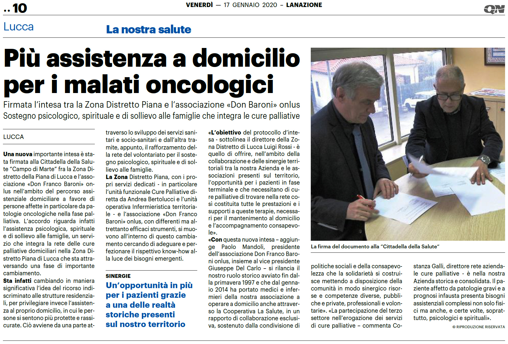 «Con questa nuova intesa – aggiunge Paolo Mandoli, presidente dell'Associazione Don Franco Baroni onlus, insieme al vice presidente Giuseppe Del Carlo – si rilancia il nostro ruolo storico avviato fin dalla primavera 1997 e che dal gennaio 2014 ha portato medici e infermieri della nostra Associazione a operare a domicilio anche attraverso la Cooperativa La Salute, in un rapporto di collaborazione esclusiva, sostenuto dalla condivisione di politiche sociali e della consapevolezza che la solidarietà si costruisce mettendo a disposizione della comunità in modo sinergico risorse e competenze diverse, pubbliche e private, professionali e volontarie».